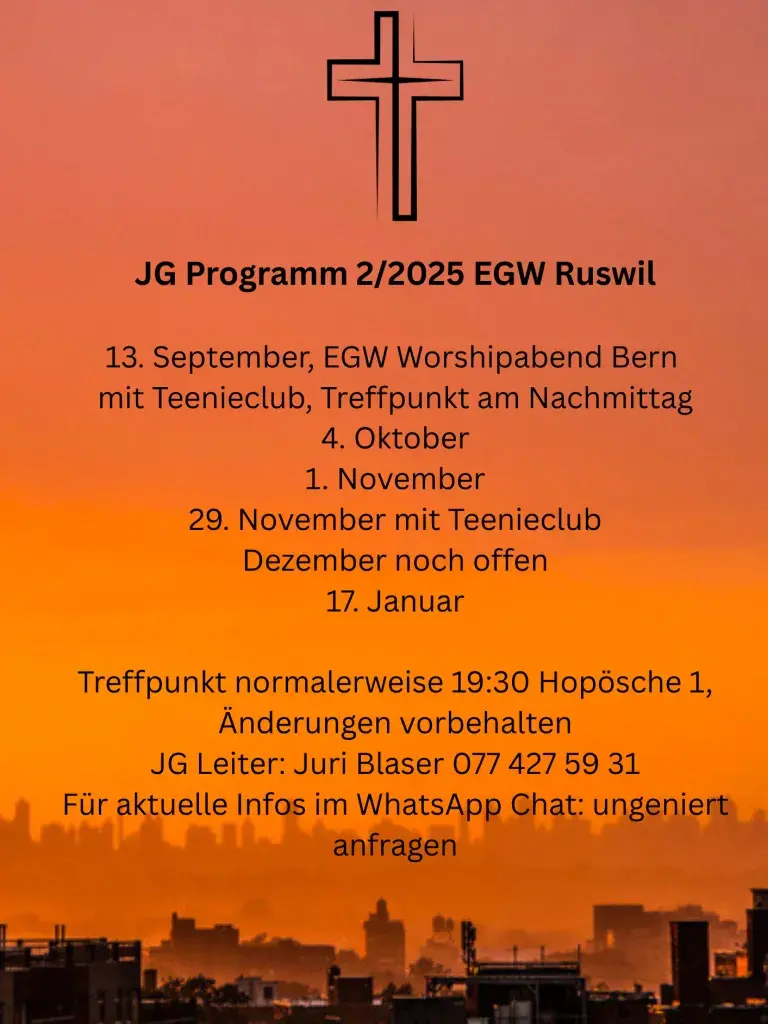 • Wer: Für Jugendliche ab 1. Lehrjahr. Die JG ist eine Gruppe junger Leute die sich regelmässig zu einem vorbereiteten Programm trifft. Dazu gibt es jeweils einen Input zum christlichen Glauben. Weil es nur zusammen JG ist, laden wir dich ein.